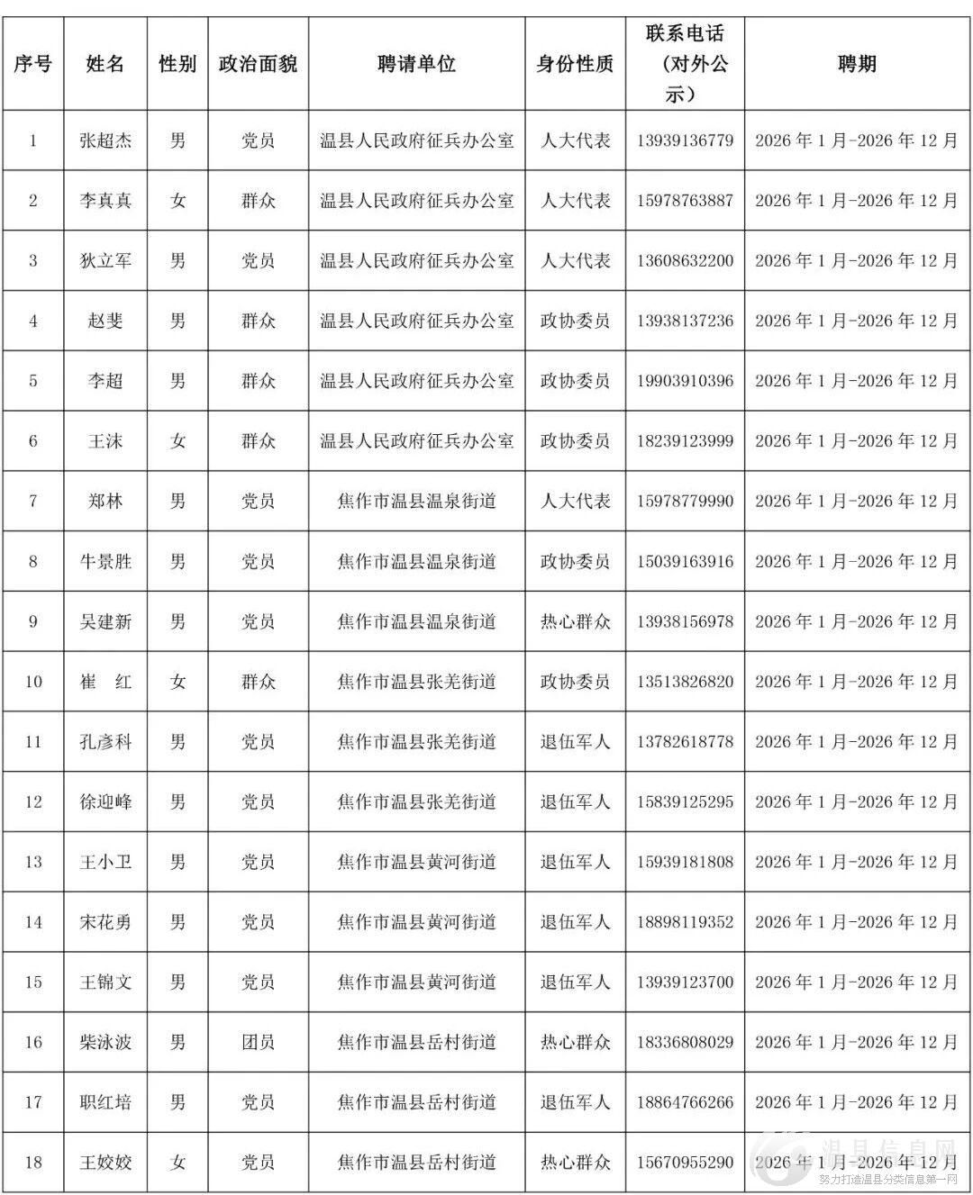 温县2026年上半年廉洁征兵监督员公示